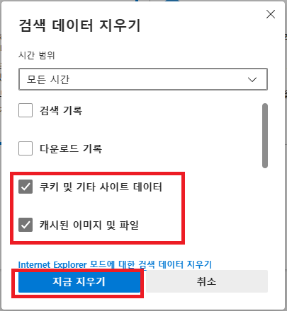 3. "쿠키 및 기타 사이트 데이터", "캐시된 이미지 및 파일" 체크 후 삭제